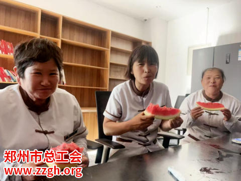 活动现场,工会驿站的工作人员将一个个西瓜送到室外工作人员手中,大家脸上洋溢着幸福的笑容。一位保洁人员接过西瓜后感激地说:“天气这么热,能吃到这么甜的西瓜,心里特别凉快,也感受到了大家对我们的关心。
