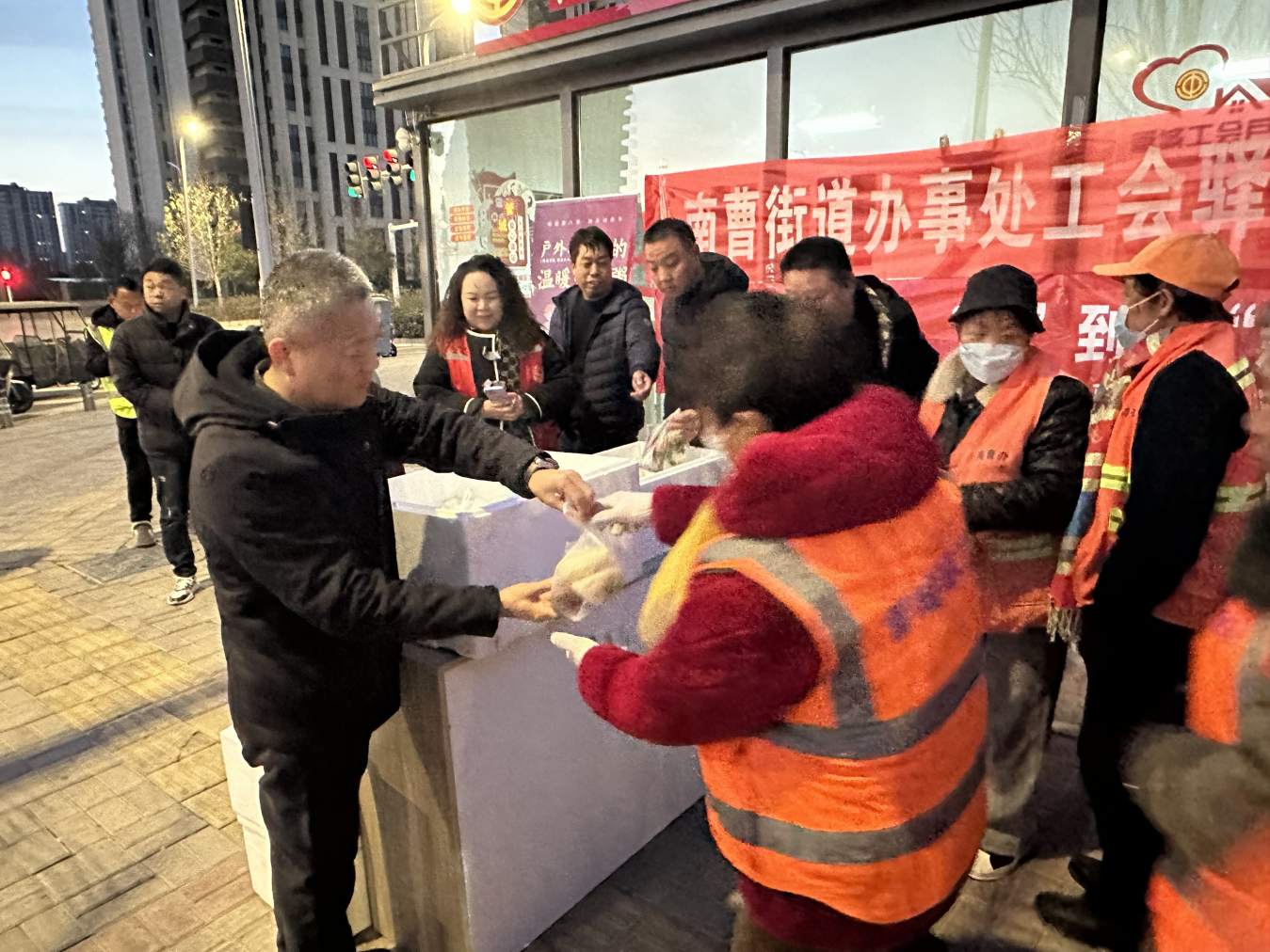 管城区南曹街道办事工会联合会依托工会驿站开展以“情暖冬日,爱心腊八”为主题的腊八节活动,由办事处副主任荆留增带领工会爱心驿站工作人员、志愿者们早早来到现场,与志愿者们热情地招呼过往的环卫工人、快递小哥等品尝一碗香暖四溢,热气腾腾的腊八粥及包子、茶鸡蛋等早点,并送上节日的问候。此次活动共发放100余份,慰问群体们接过腊八粥,脸上洋溢着幸福的笑容,纷纷对爱心驿站的善举表示感谢。现场秩序井然,大家在领粥的同时,也相互交流着节日的喜悦,整个活动现场充满了浓浓的温情。