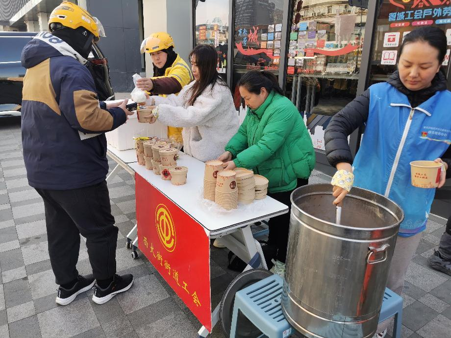 管城区紫荆山南路街道办事处紫南社区工会联合会及辖区商户开展“浓情腊八,暖新粥到”志愿服务活动。活动现场,工作人员准备好精心熬制的腊八粥及餐具赠送给辖区的京东快递小哥、出租车司机等新就业劳动者及辛苦劳作的户外工作群体,通过腊八送粥活动与他们深入交流,了解他们的生活,倾听他们的需求和建议,并叮嘱他们时刻注意自己的身体,注意在外工作时注意交通安全,向他们致以节日的问候,为他们送去冬日温暖。
