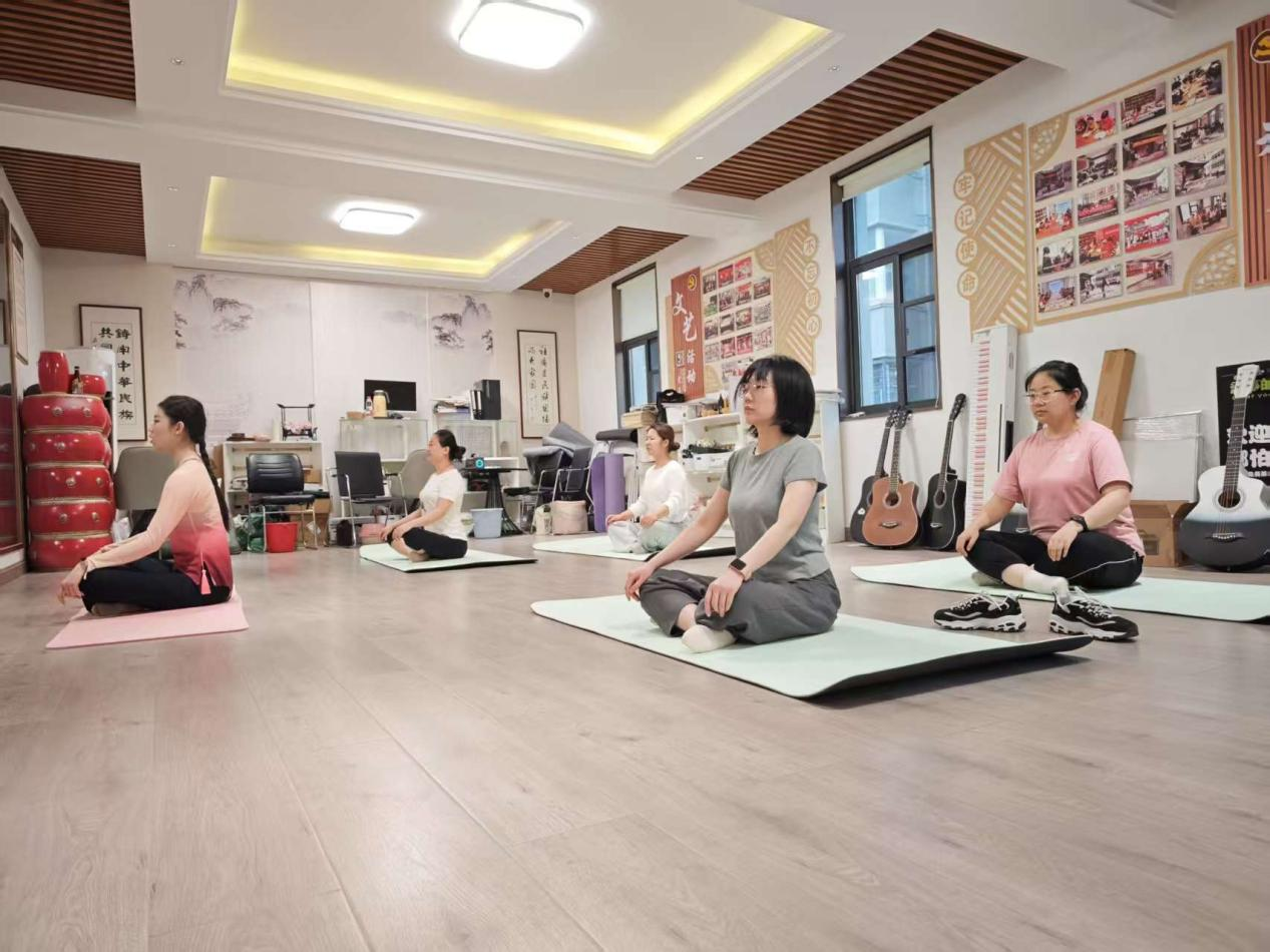 舒缓的音乐响起,女职工们在老师的带领下开始了热身活动。从简单的颈部转动、肩部舒展到腰部的轻柔摆动,每一个动作都帮助宝妈们逐渐放松紧绷的身体,唤醒身体的活力。大家认真地跟随着老师的节奏,脸上的神情也从最初的些许疲惫变得专注而投入。最后大家静静地躺在瑜伽垫上,在老师轻柔的引导语中,放松全身的肌肉,舒缓紧张的神经。整个活动现场一片静谧,女职工们的脸上都洋溢着平静和满足。