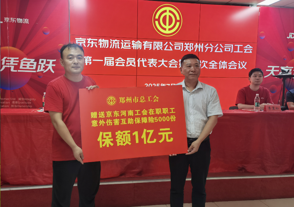 会上,许振亚向京东河南工会赠送在职职工意外伤害互助保障险5000份,保额价值1亿元,为维护新就业形态劳动者合法权益提供了重要保障。