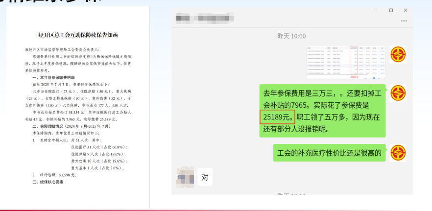 优化续保流程,“到期告知函”主动推送。保单到期前发送函件整合缴费明细、理赔数据、续保清单及成效总结,支持随时核验,以透明服务巩固续保基础。从制度实施至今已发送函件70余份。提升续保时效,“续保无忧办”精准服务。到期前10个工作日电话提醒,同步完成到期告知、推送《续保材料清单》、指导材料一次备齐三项动作,压缩办理时限超50%。强化精准服务,“兜底服务+”响应升级。精准高效解答职工会员报销疑问,提供全流程政策指导(日均接听咨询40余人次);开展主动问需、上门回访(如为大额理赔职工定制续保方案)等差异化服务,满足多元需求。