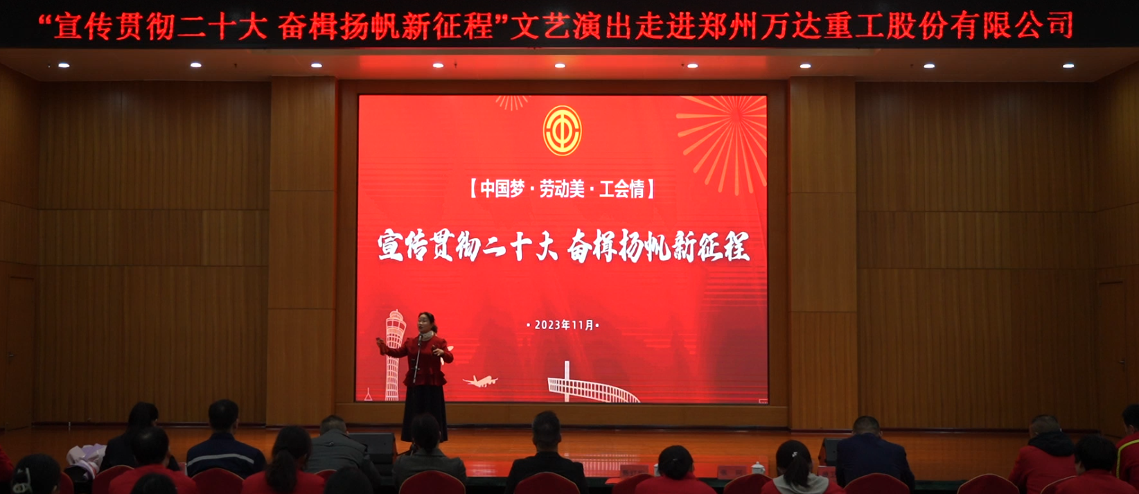 11月10日,伴随着悠扬的歌声,郑州万达重工股份有限公司侧楼会议厅内传出阵阵掌声和欢笑声,由郑州航空港实验区总工会主办,郑州万达重工股份有限公司工会委员会、郑州航空港融媒体中心联合协办的《中国梦·劳动美·工会情—宣传贯彻二十大 奋楫扬帆新征程》第九场文艺演出在郑州万达重工股份有限公司举行,郑州航空港实验区总工会“文艺轻骑兵”艺术团各位青年演员以及职工代表用歌曲、舞蹈、相声等精彩节目,以文化活动的形式歌颂党的百年光辉,宣传党的二十大精神,展现新时代广大职工群众坚定不移跟党走、昂首奋进新征程的精神风貌。