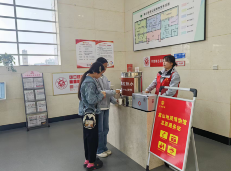地质博物馆工会驿站志愿者为游客提供游览咨询、线路指引服务、免费开水、应急药包等服务。