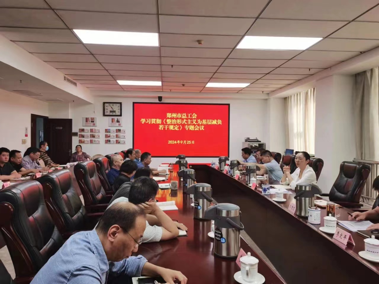 9月25日,郑州市总工会召开整治形式主义为基层减负专题会议,由党组书记、常务副主席王玉红主持。会议全文传达学习了《整治形式主义为基层减负若干规定》,逐个通报了中央层面、省级层面、外省通报的负面典型案例,研究部署市总工会有关工作。