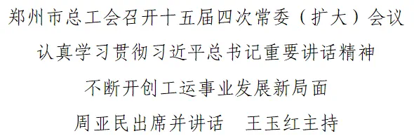 5月7日,郑州市总工会十五届四次常委(扩大)会议召开,学习贯彻习近平总书记在庆祝中华全国总工会成立100周年暨全国劳动模范和先进工作者表彰大会上的重要讲话精神,贯彻全总、省总、市委部署要求,安排落实举措。市人大常委会副主任、市总工会主席周亚民出席并讲话,市总工会党组书记、常务副主席王玉红主持。全国劳动模范和先进工作者代表郭超、陶留海、马玉璞发言。