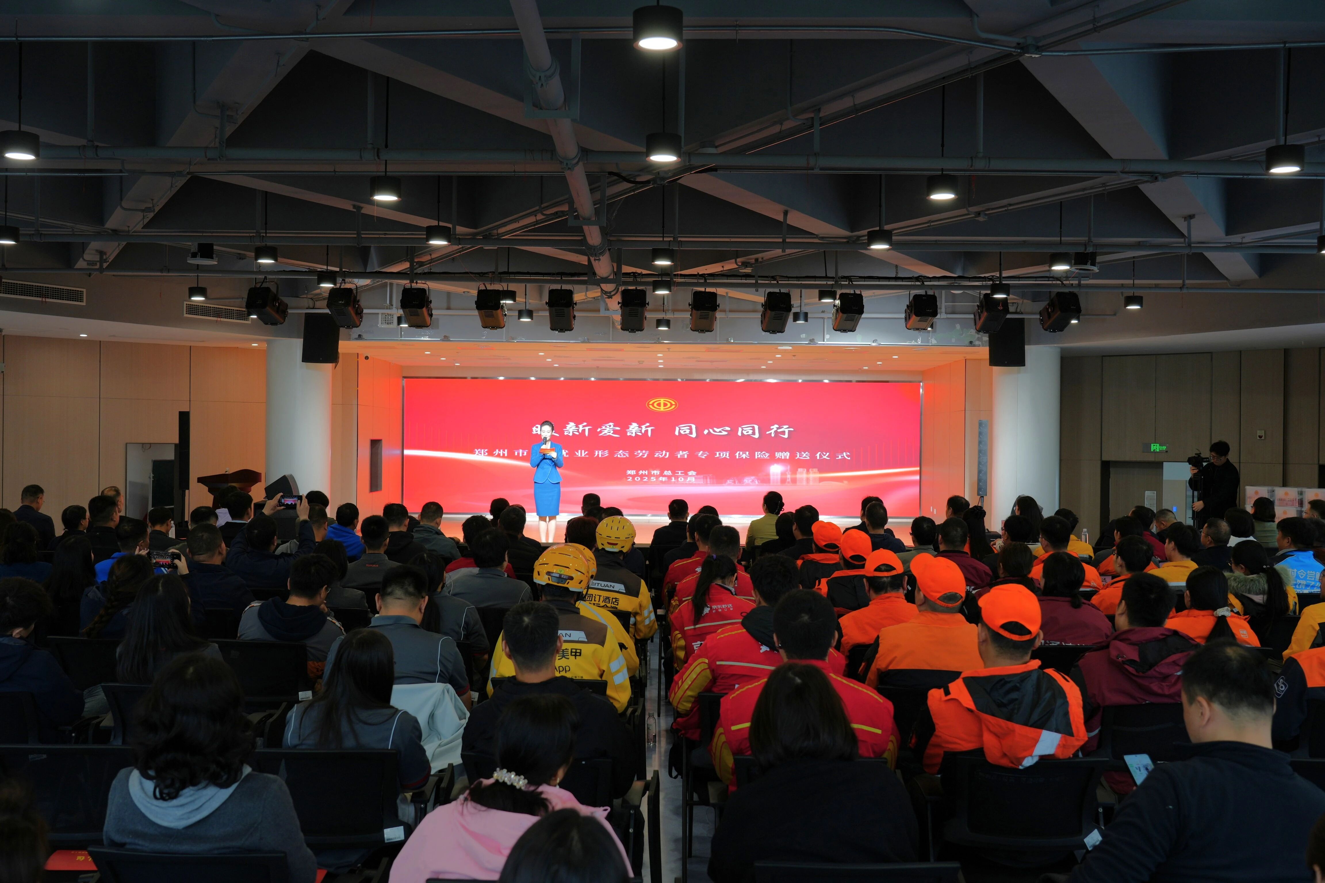 为深入贯彻习近平总书记关于关心关爱新就业形态劳动者的重要指示批示精神,10月11日,郑州市总工会以“暖新爱新 同心同行”为主题举行新就业形态劳动者专项保险赠送仪式。省总工会副主席、党组成员刘雪峰出席活动。市委副秘书长、市委智慧办常务副主任曹勇,郑州市总工会党组书记、常务副主席王玉红以及市委社会工作部、市委政法委等部门分管领导,各开发区、区县(市)总工会副主席,新业态平台企业工会主席及新就业形态劳动者代表等近200人参加活动。