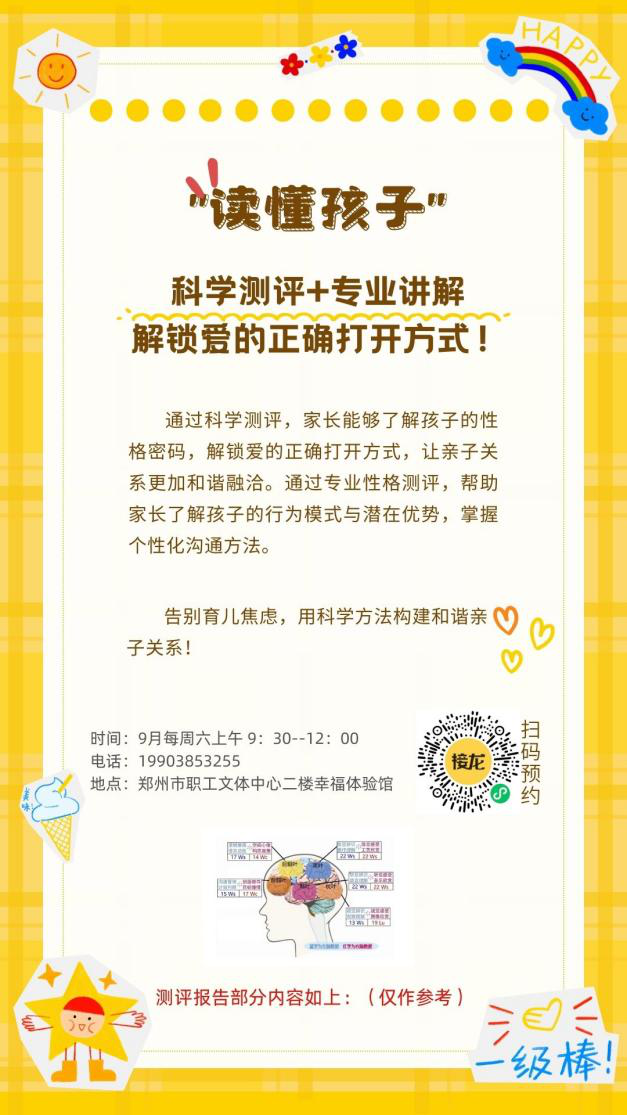 在本月的每周六,您还可以带孩子(7 - 18岁)到幸福体验馆,免费享受天赋优势测评服务。通过专业的测评,帮助您更好地了解孩子的天赋和优势,让亲子沟通更加科学、融洽,为孩子的成长提供更有针对性的指导。