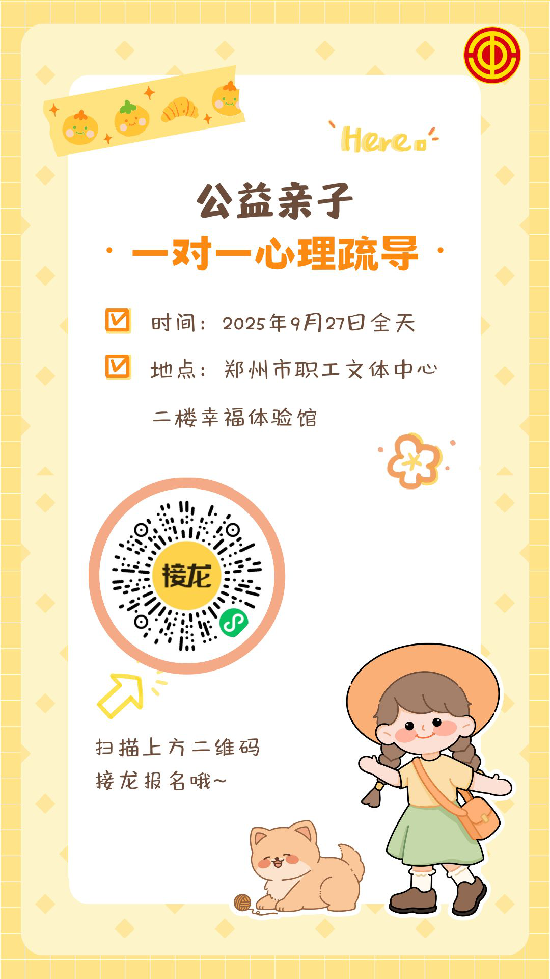 9月27日,郑州市总工会将举办公益亲子一对一心理疏导活动,专业心理咨询师为亲子家庭提供心理疏导,增进亲子感情,让家庭更和谐。