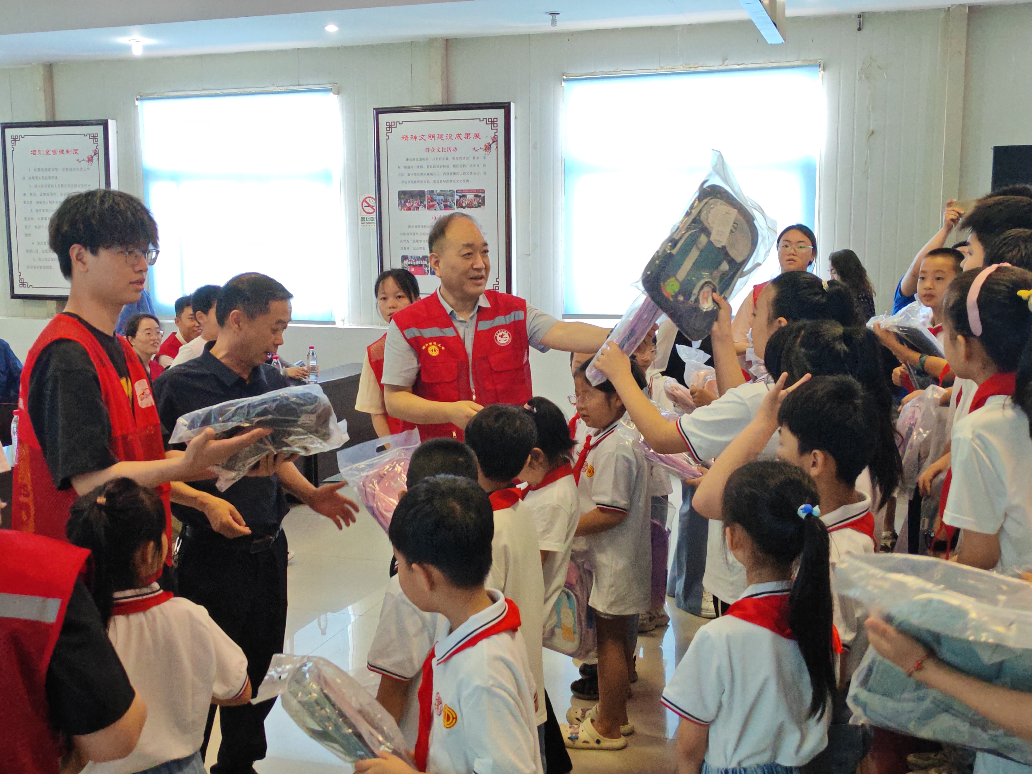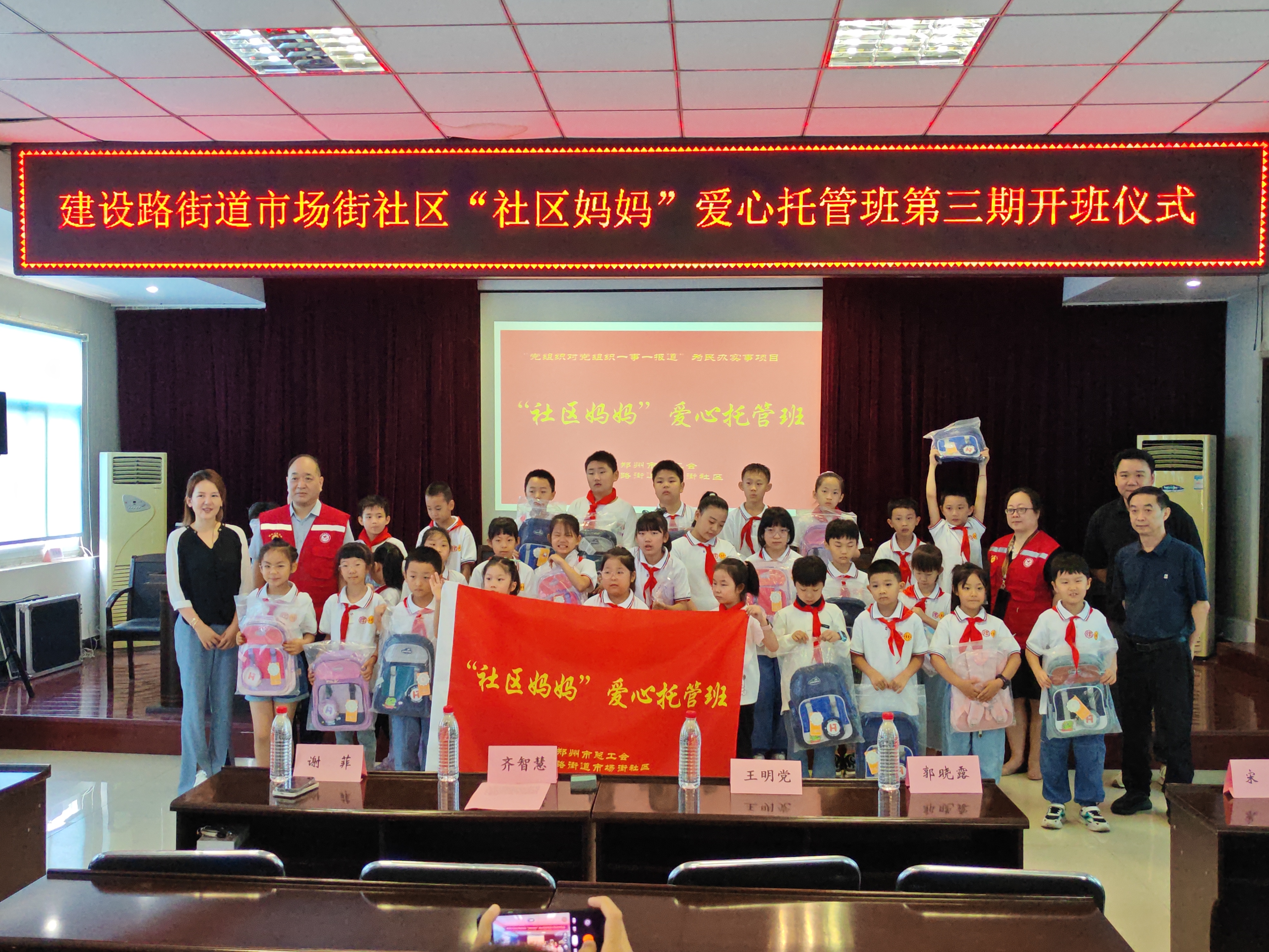 “没有共产党,就没有新中国……”孩子们铿锵有力的大合唱拉开了开班仪式的帷幕,随后,齐主席上台进行了致辞,对社区和街道积极响应工会号召,以及广大工作人员和志愿者们的辛勤付出和积极努力表示感谢,嘱托小朋友们要听从老师的安排,遵守纪律、团结友爱、好好学习,度过一个难忘而美好的假期!随后,齐主席与市总工会的志愿者们为小朋友们送上了书包、画笔等学习大礼包,祝愿孩子们健康快乐成长,每个小朋友都开心激动的不行,幸福的笑容溢满脸庞,一个小朋友大声喊到:“我明天就要背着新书包来上课!”大家都被他那天真的话语给逗乐了!