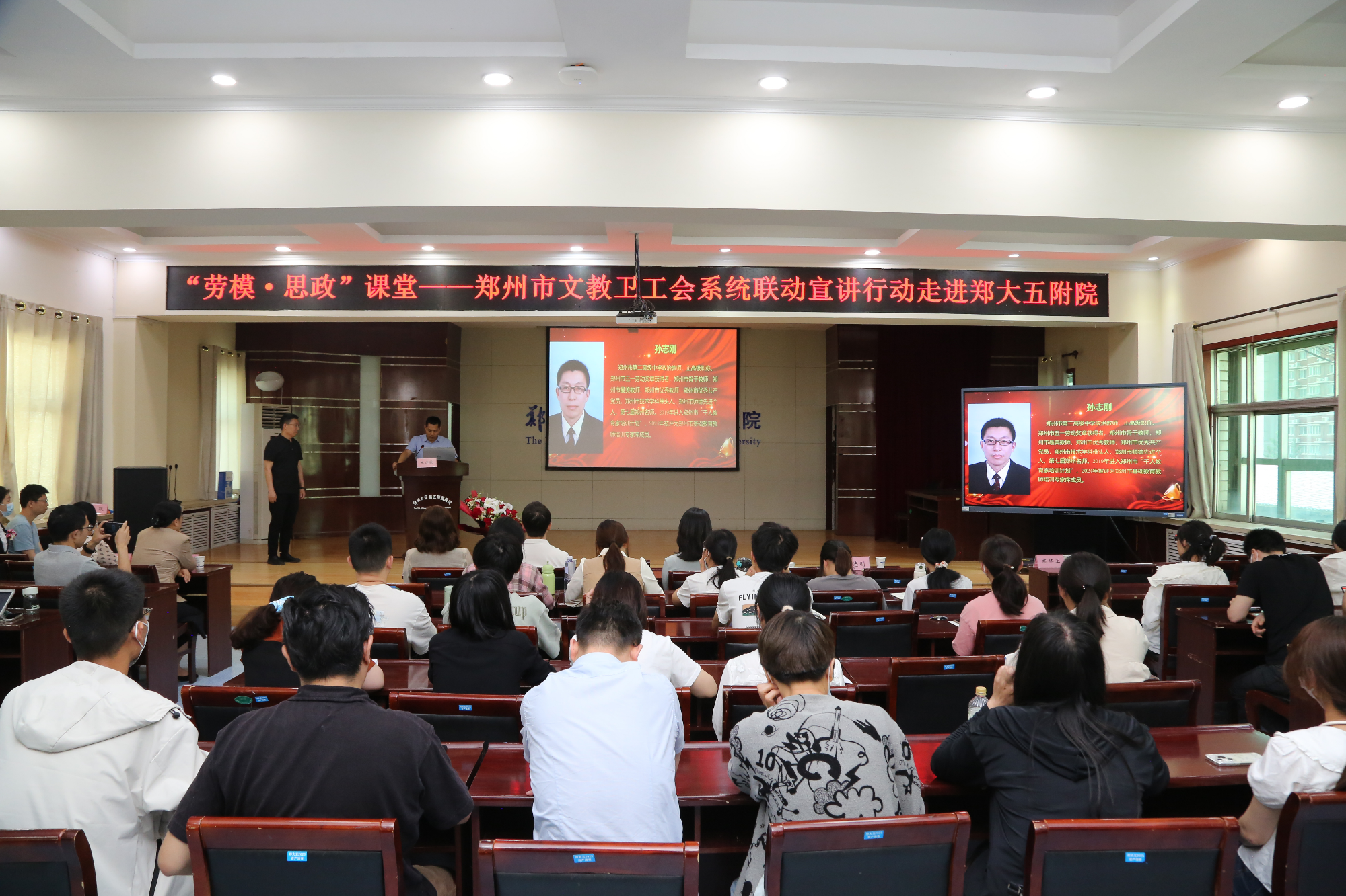 为充分发挥劳模工匠榜样示范作用和思政教师的专业优势,团结引导广大职工增强爱岗敬业意识,筑牢思想根基,恪守职业道德,5月16日下午,郑州市总工会邀请了全国五一劳动奖章获得者范阳阳,郑州市五一劳动奖章获得者陈文霞、孙志刚,走进郑州大学第五附属医院,为医院职工讲述个人成长奋斗历程,传授做人学艺经验,畅谈报国理想信念,200余名职工代表参加活动。