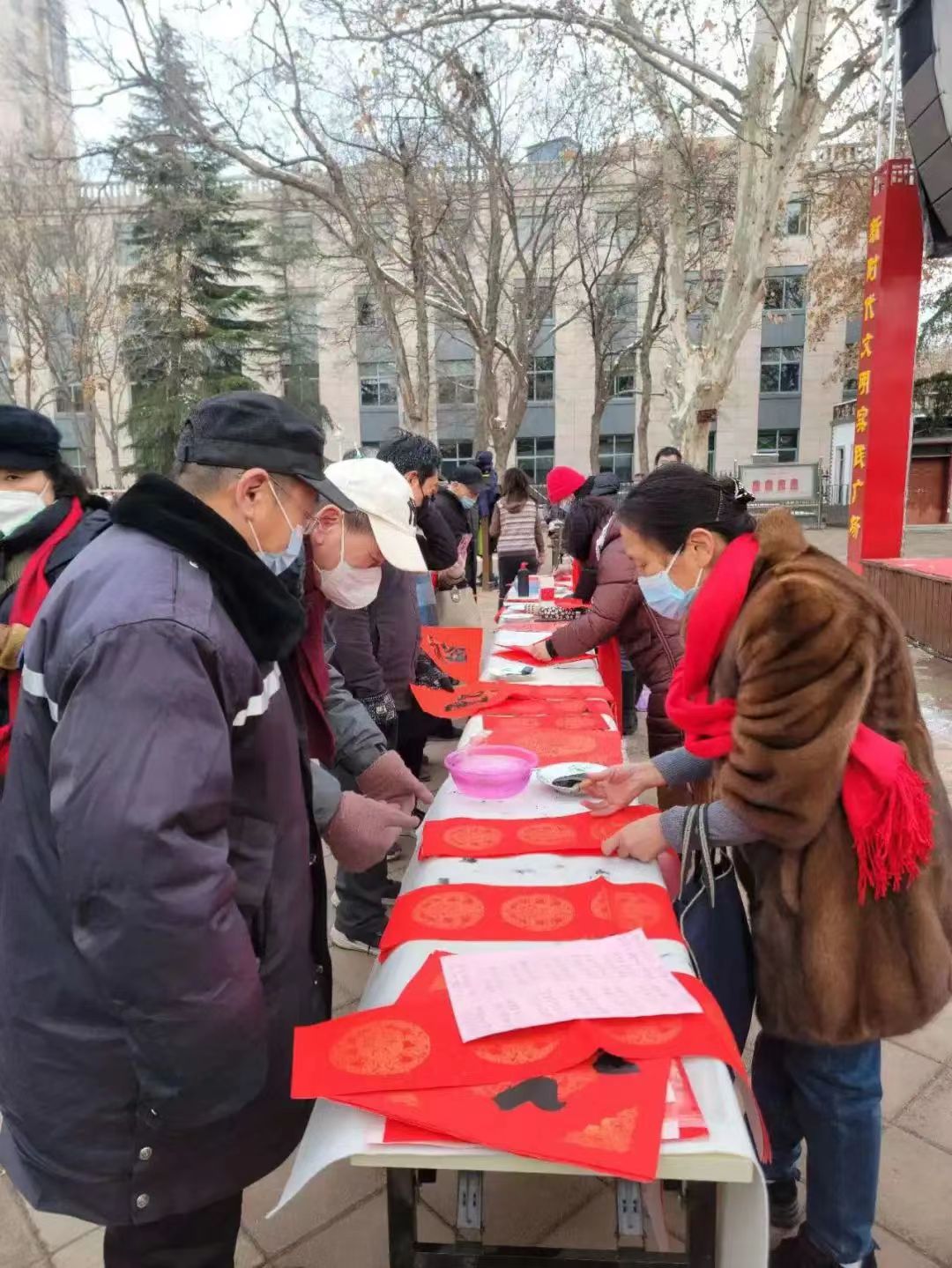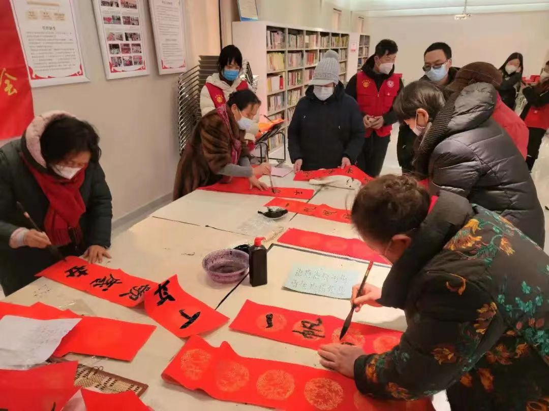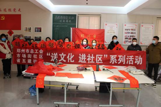 1月16日农历腊月二十五,五一公园欢声笑语,省五建社区喜气洋洋。落实“关爱你我他(她)·温暖千万家”行动工作部署,按照元旦春节期间开展“送万福、进万家”书法公益活动和“送春联贴春联”活动要求,郑州市总工会联合郑州市女子书画家协会组织书法家分别到五一公园和省五建社区开展了迎新春义写春联活动,为快递小哥、环卫职工、志愿者以及社区群众书写送出春联600多幅。在此之前,市总工会联合郑州银行通过微信平台网上预约的形式为全市有需要的职工送出新春福袋30000份,福袋内春联、窗花、福字、红包一应俱全,职工线下通过郑州银行40个营业网点就近领取。“送万福、进万家”迎新春送春联活动在声声祝福中让兔年新春红红火火、年味浓郁。