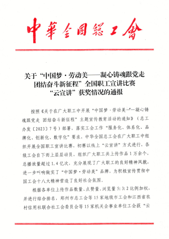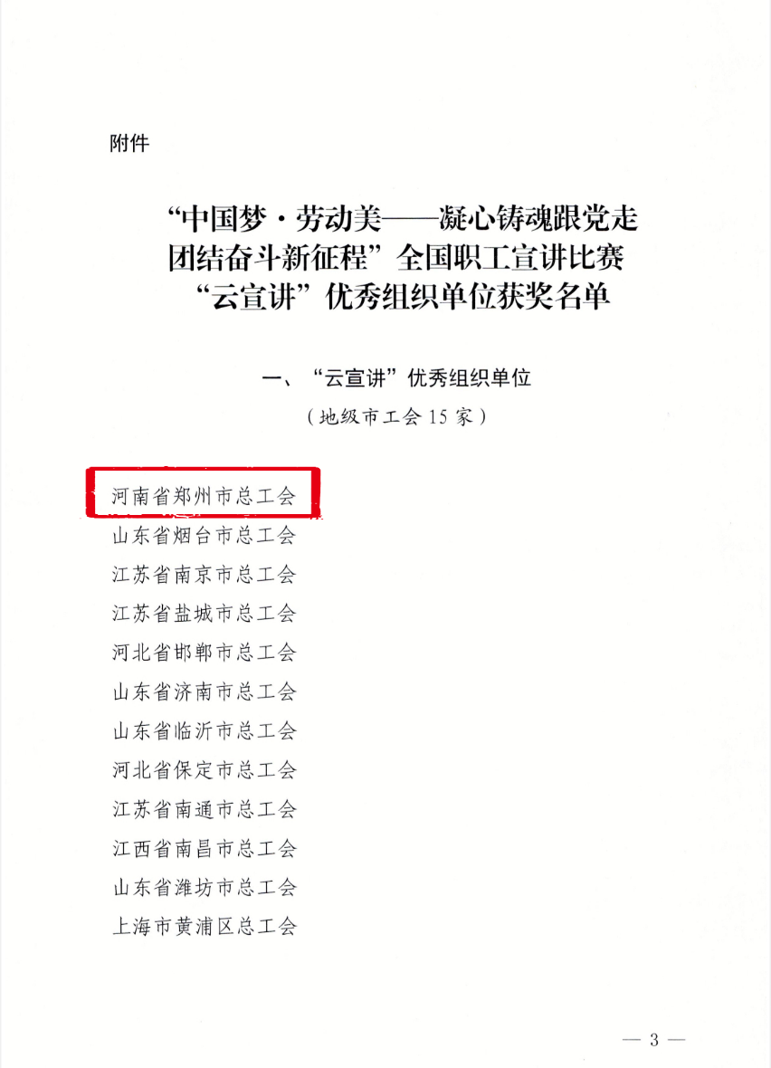 12月4日,全国总工会宣传教育部行文对“中国梦·劳动美——凝心铸魂跟党走 团结奋斗新征程”全国职工宣讲比赛“云宣讲”获奖情况进行通报,对全国15家地市级工会和15家机关企事业单位工会优秀组织单位予以通报表彰。郑州市总工会荣登全国地市级工会优秀组织单位榜首,郑州市公共交通集团有限公司工会委员会在机关企事业单位工会优秀组织单位榜上有名。